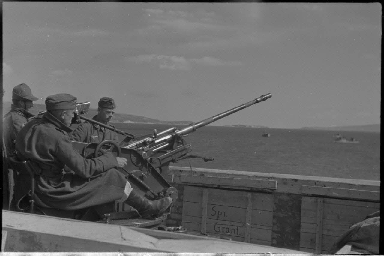 En Crète, des artilleurs allemands et italiens derrière une pièce de DCA légère de 2 cm FlaK.