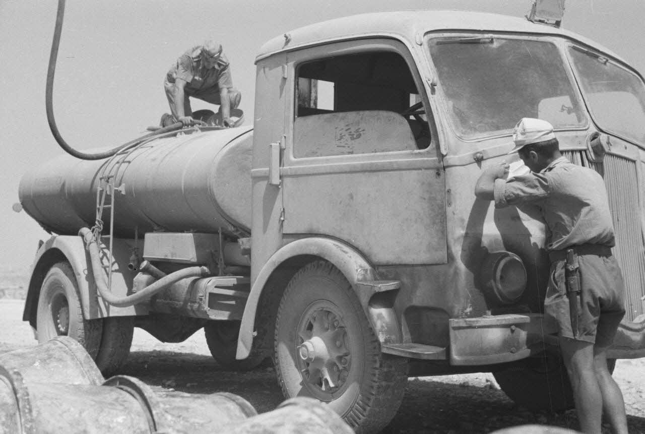 Ces jerrycans de 20 litres ne suffisent plus pour les cuisines de campagne. Une citerne d'eau contenant 970 litres sur laquelle on peut lire "Trinkwasser" (eau potable). Un camion citerne de l'armée de l'air italienne (on note l'inscription "Regia aeronautica"), fonctionnant au diesel, équipé d'une citerne de 6000 litres. Un point d'eau en Cyrénaïque.