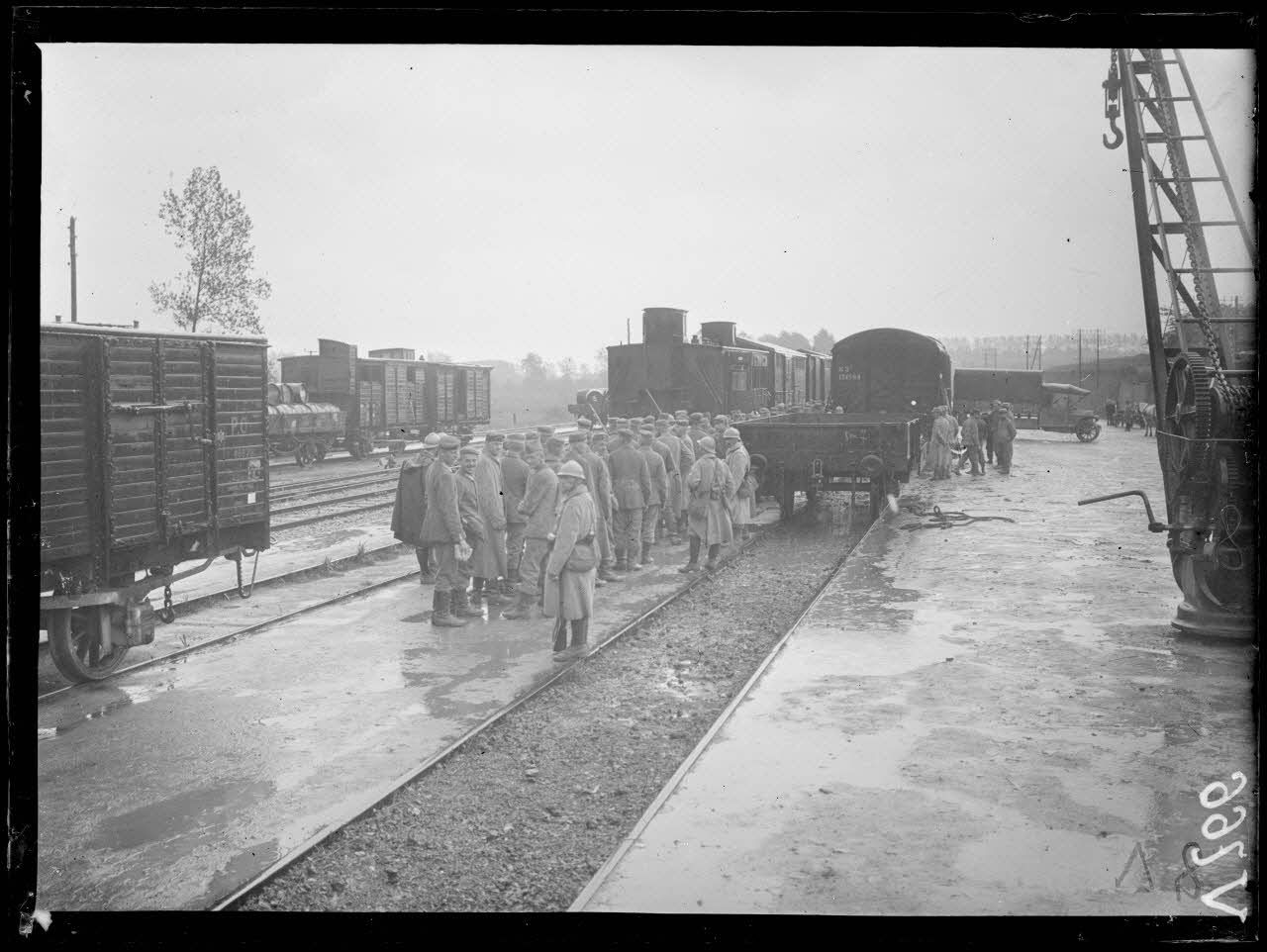 En gare de Jonchery-sur-Vesle, Marne, embarquement de prisonniers allemands.