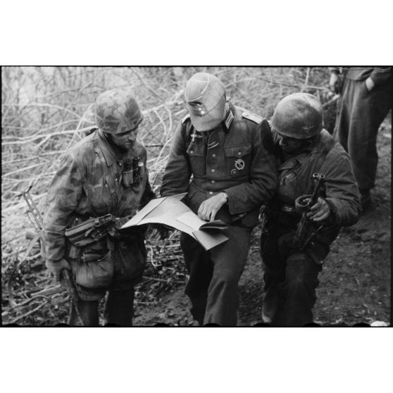 Carte à l'appui, deux parachutistes de la 4.Fallschirmjäger.Division s'entretiennent avec un sous-lieutenant d'infanterie.