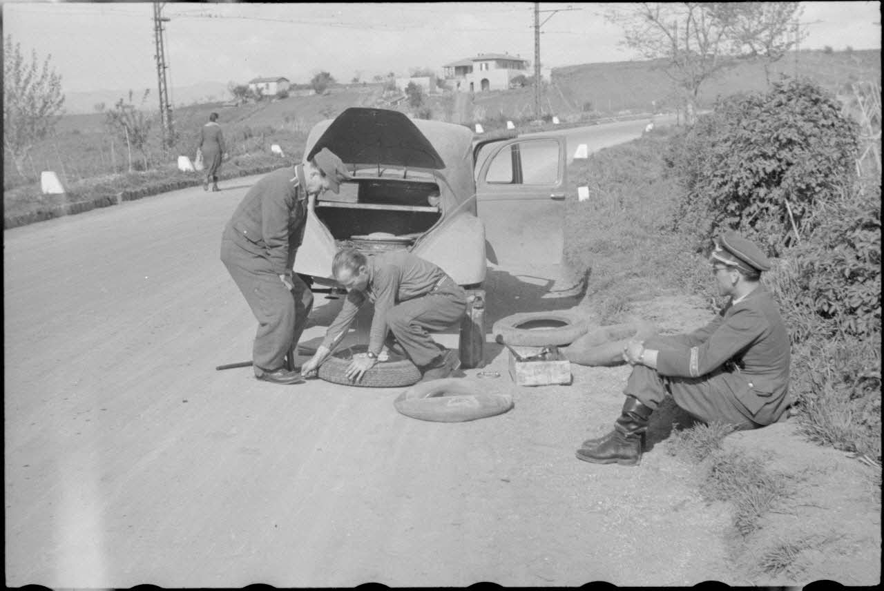 En Italie, dans le secteur de Cassino, la voiture des reporters de la section de propagagande aéroportée vient de subir une crevaison.