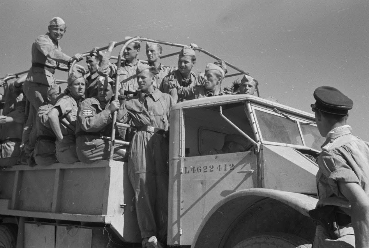 En Libye, des équipages de Junkers Ju-87 rejoignent un terrain d'aviation à bord d'un camion britannique capturé.
