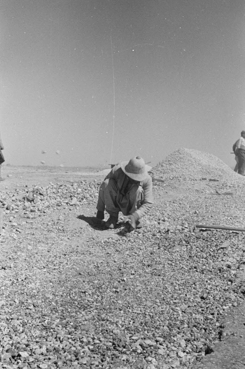En Libye, un ouvrier libyen participe à la construction d'un terrain d'aviation occupé par la Luftwaffe.