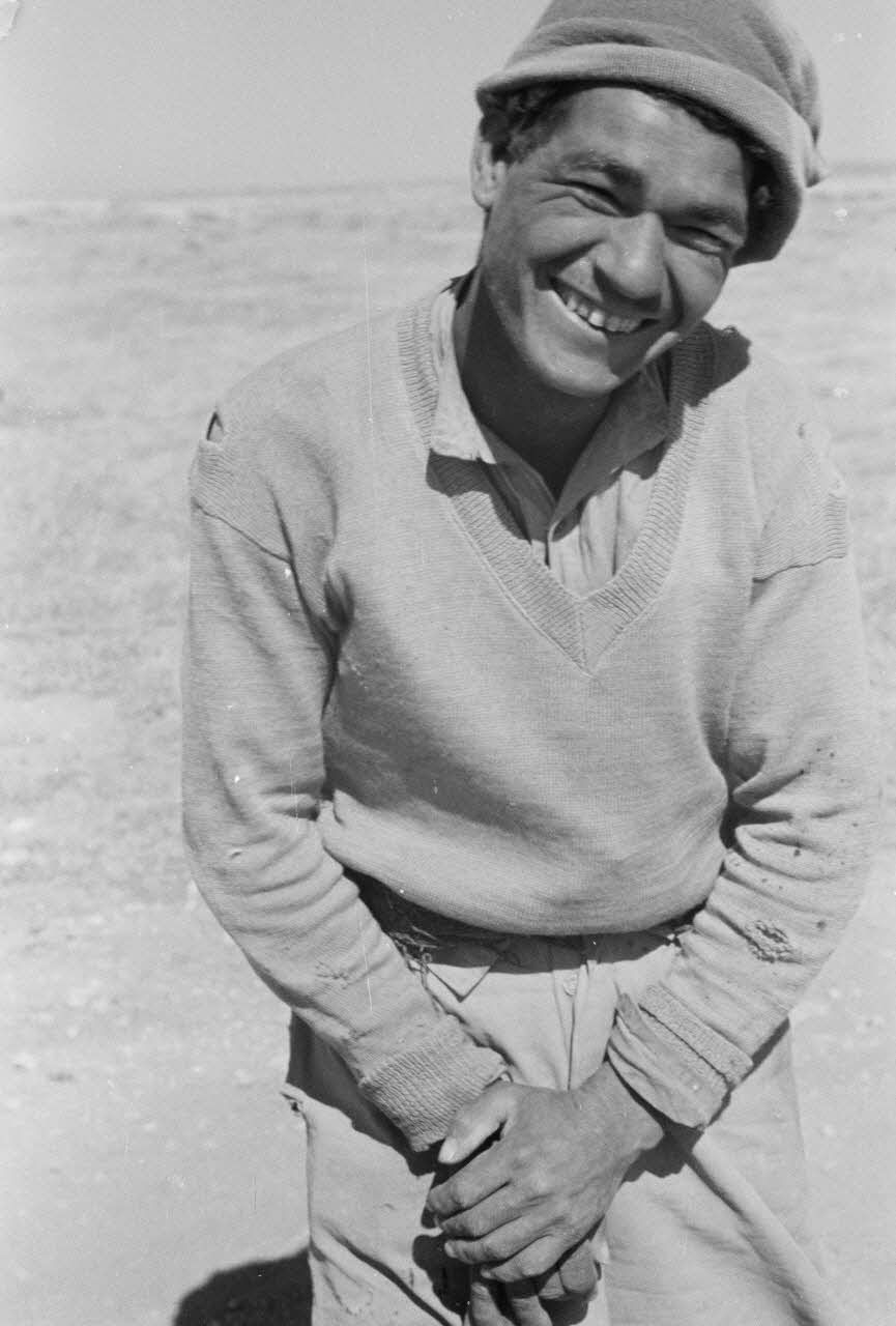 En Libye, un ouvrier libyen participe à la construction d'un terrain d'aviation occupé par la Luftwaffe.