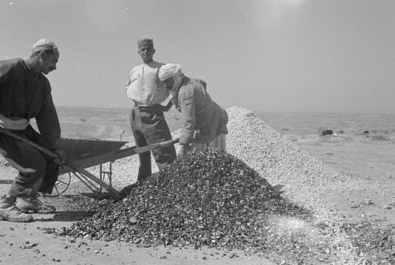 En Libye, un ouvrier libyen participe à la construction d'un terrain d'aviation occupé par la Luftwaffe.