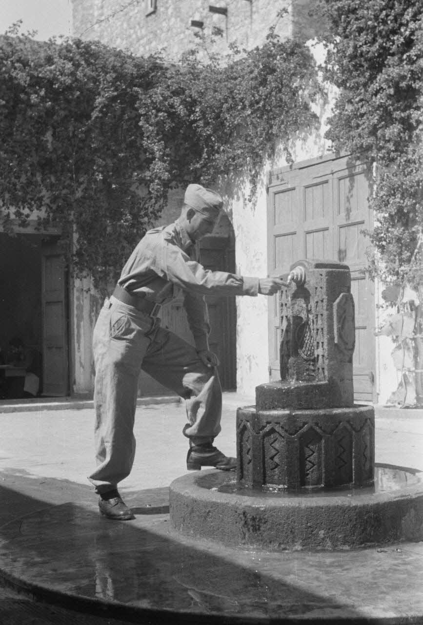 En Libye, le reporter Werner Bockelmann de la 7e compagnie de propagande de l'armée de l'air allemande (Luftwaffe Kriegsberichter Kompanie 7) devant une fontaine du souk de Derna.