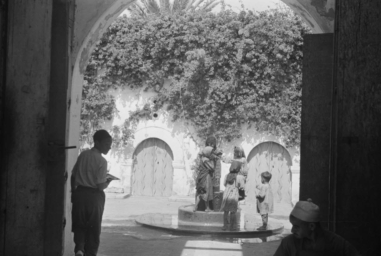 En Libye, le reporter Werner Bockelmann de la 7e compagnie de propagande de l'armée de l'air allemande (Luftwaffe Kriegsberichter Kompanie 7) devant une fontaine du souk de Derna.