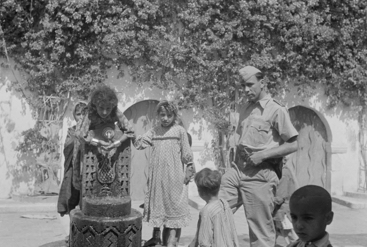 En Libye, le reporter Werner Bockelmann de la 7e compagnie de propagande de l'armée de l'air allemande (Luftwaffe Kriegsberichter Kompanie 7) devant une fontaine du souk de Derna.
