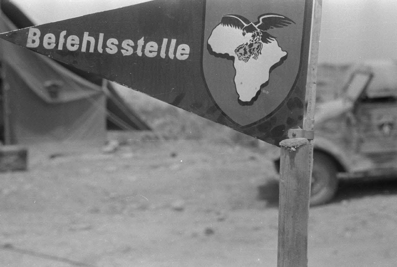 En Libye, un panneau "Befehlsstelle" indique la tente où réside le commandement du groupe de reconnaissance.