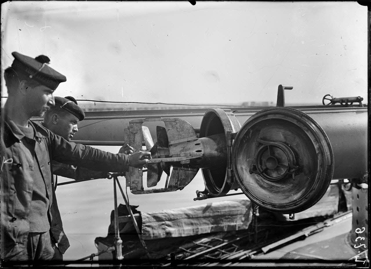 En mer. A bord du torpilleur 340. Chargement du tube lance-torpilles. Réglage des gourvernails avant la fermeture du tube. (la charge de poudre fixée dans le culot du tube). [légende d'origine]