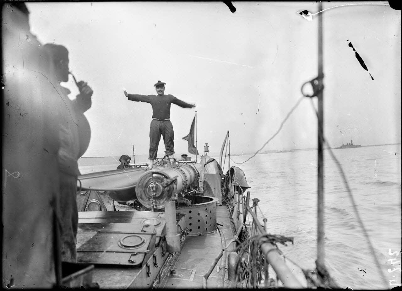 En mer. L'arrière du torpilleur 340. Transmission d'un ordre par signaux à bras. [légende d'origine]