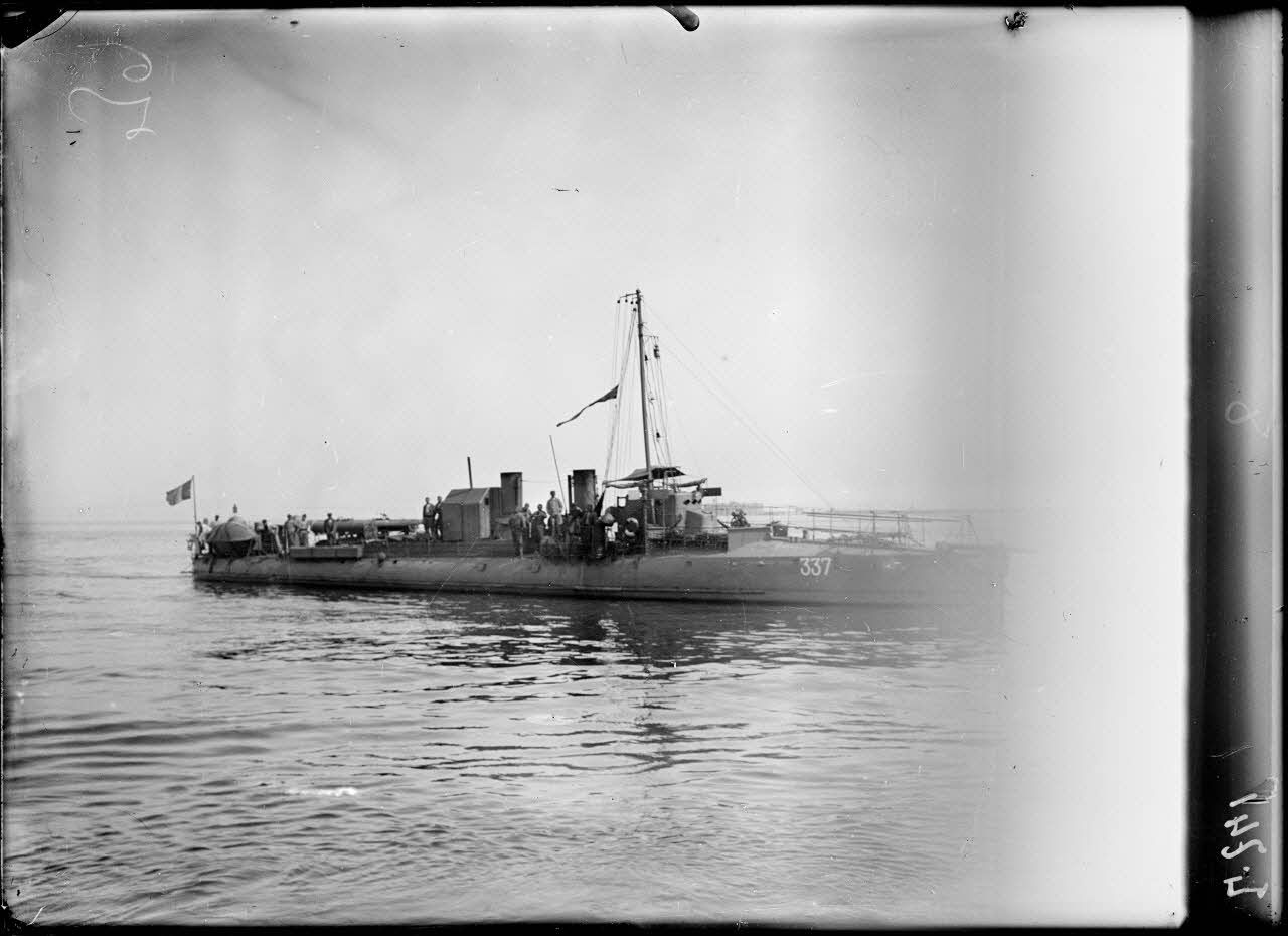 En mer. A bord du torpilleur 340. Le canot ramassant les toprilles lancées.