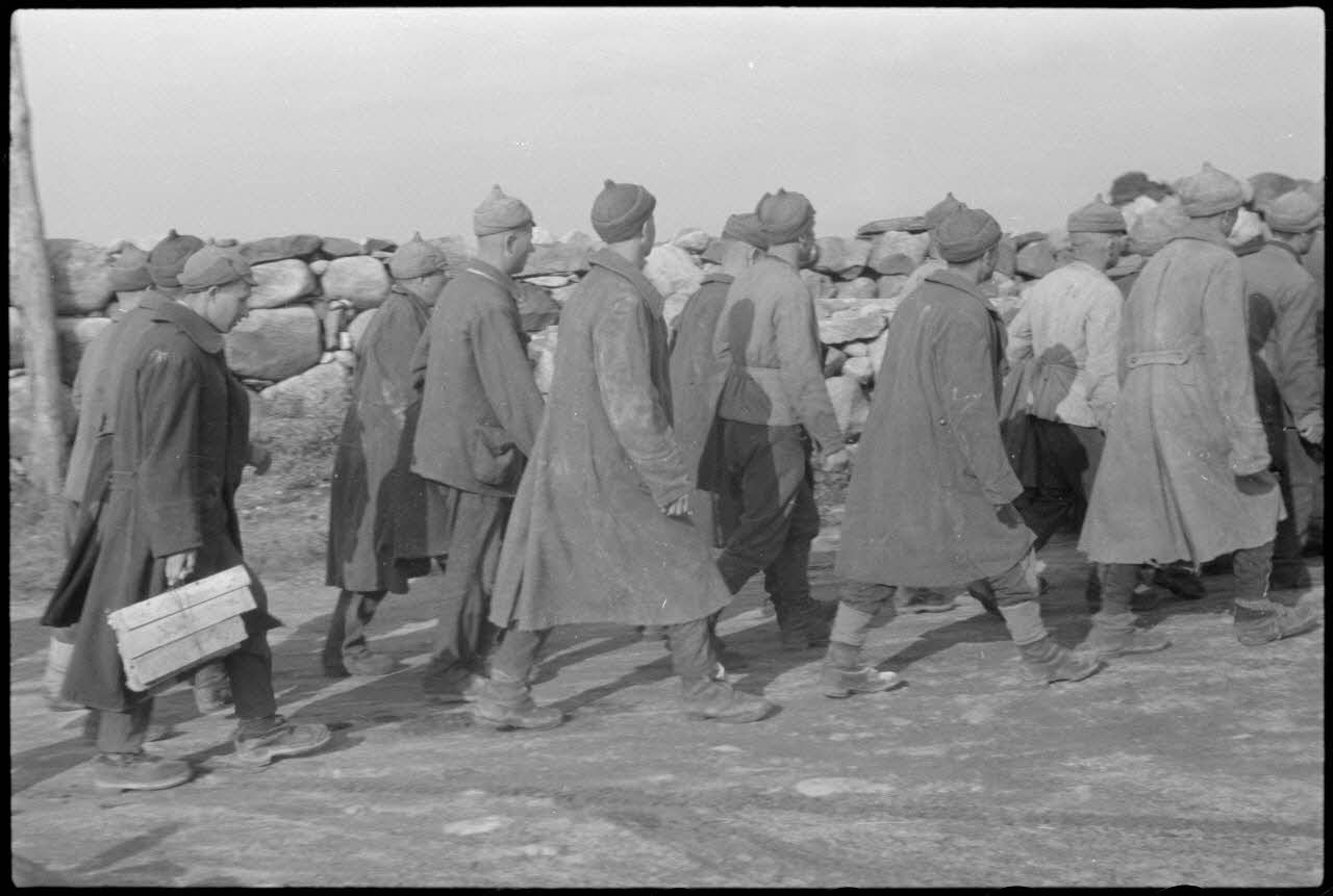 En Norvège, à proximité du terrain d'aviation de Banak, des prisonniers soviétiques lors de manoeuvres communes entre l'armée de terre allemande et le 8./LLG 1 (Lulftlandegeschwader 1).