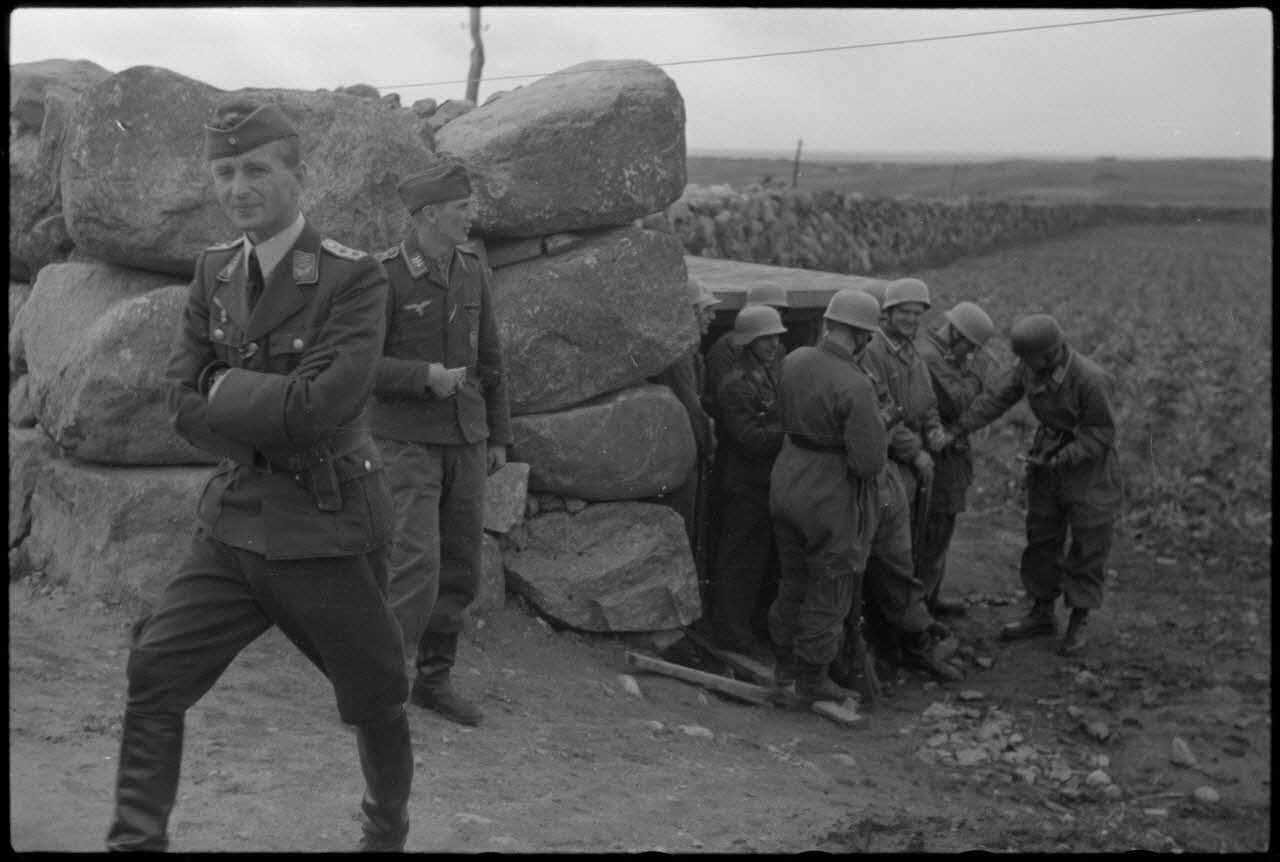 Après un briefing, les premiers parachutistes équipés de mitrailleuses MG-13 courent se poster pour le début de la manoeuvre. Plus loin, pour les besoins de la manoeuvre commune, des fantassins allemands joueront le rôle des ennemis.