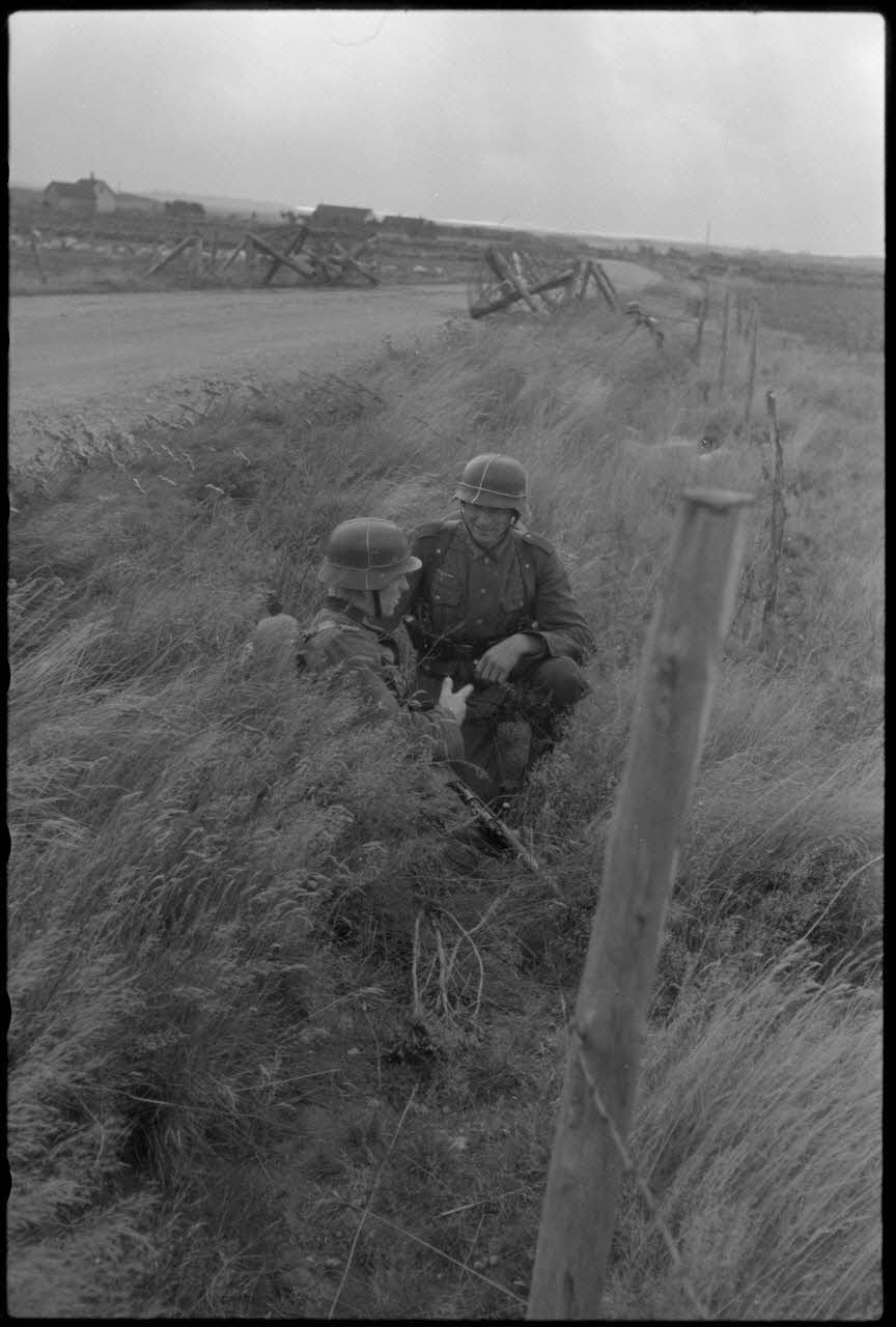 Après un briefing, les premiers parachutistes équipés de mitrailleuses MG-13 courent se poster pour le début de la manoeuvre. Plus loin, pour les besoins de la manoeuvre commune, des fantassins allemands joueront le rôle des ennemis.