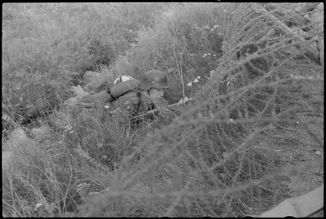 Après un briefing, les premiers parachutistes équipés de mitrailleuses MG-13 courent se poster pour le début de la manoeuvre. Plus loin, pour les besoins de la manoeuvre commune, des fantassins allemands joueront le rôle des ennemis.