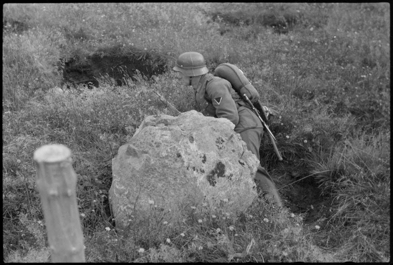 Après un briefing, les premiers parachutistes équipés de mitrailleuses MG-13 courent se poster pour le début de la manoeuvre. Plus loin, pour les besoins de la manoeuvre commune, des fantassins allemands joueront le rôle des ennemis.