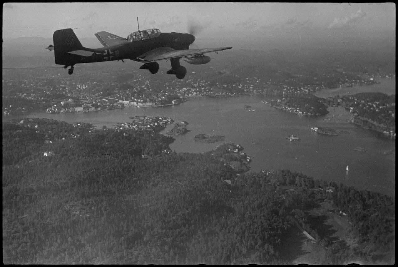 Exercice de remorquage de planeurs du Luftlandegeschwader 1, les Junkers Ju-87 "Stuka" survolent les fjords de Norvège.