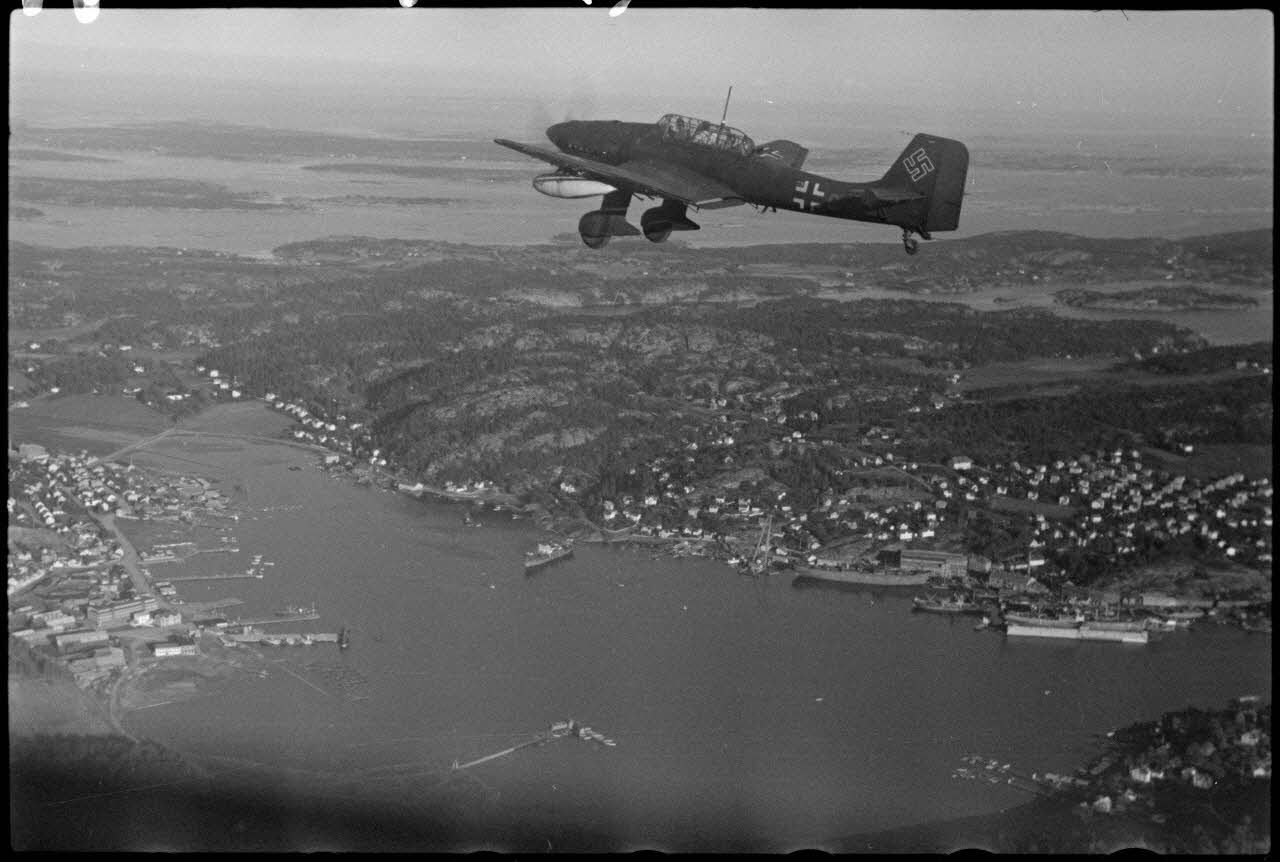 Exercice de remorquage de planeurs du Luftlandegeschwader 1, les Junkers Ju-87 "Stuka" survolent les fjords de Norvège.