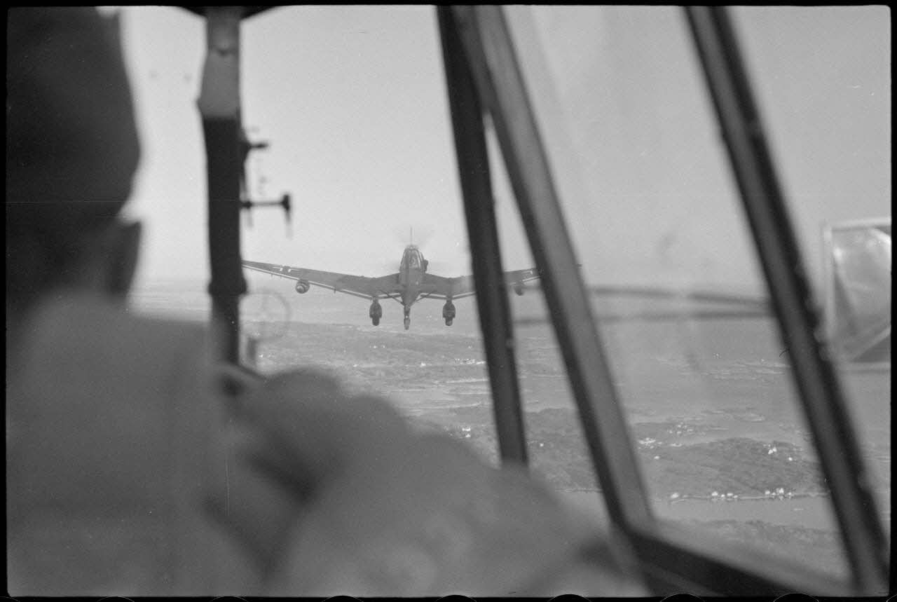 En Norvège, lors de manoeuvres, le reporter Stocker photographie deux chasseurs Messerschmitt Bf-109 alors qu'il est à bord d'un planeur DFS-230 du 8./Luftlandegeschwader 1.