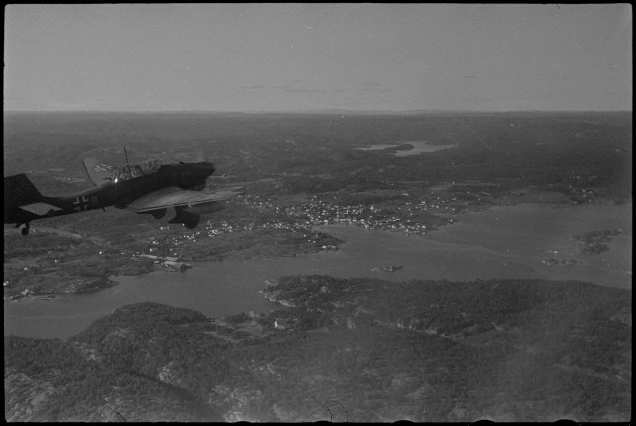 Exercice de remorquage de planeurs du Luftlandegeschwader 1, les Junkers Ju-87 "Stuka" survolent les fjords de Norvège.