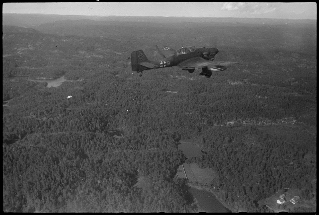Exercice de remorquage de planeurs du Luftlandegeschwader 1, les Junkers Ju-87 "Stuka" survolent les fjords de Norvège.