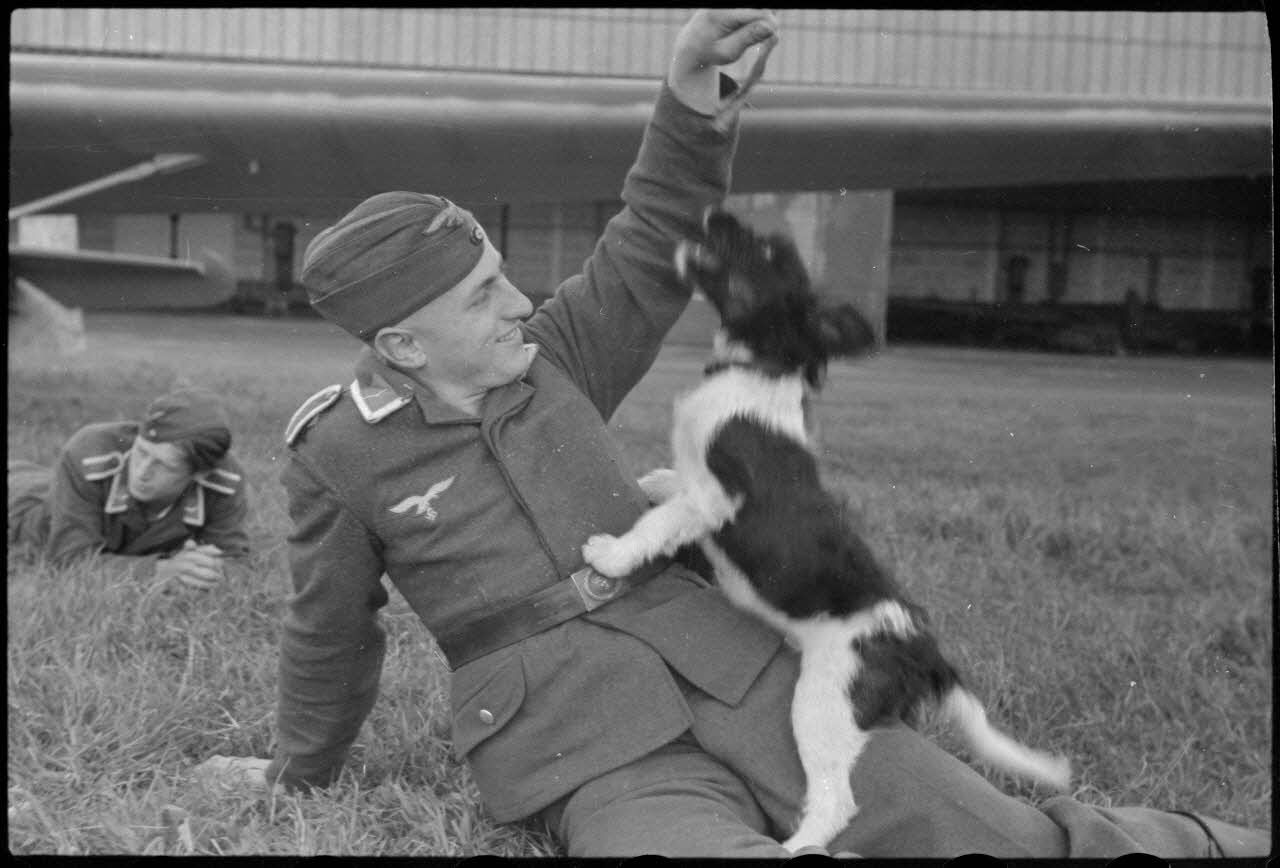 En Norvège, sur l'aérodrome de Stavanger-Sola, lors d'une démonstration 8./LLG 1 (Lulftlandegeschwader 1), un sous-officier joue avec un chien, mascotte de l'unité.
