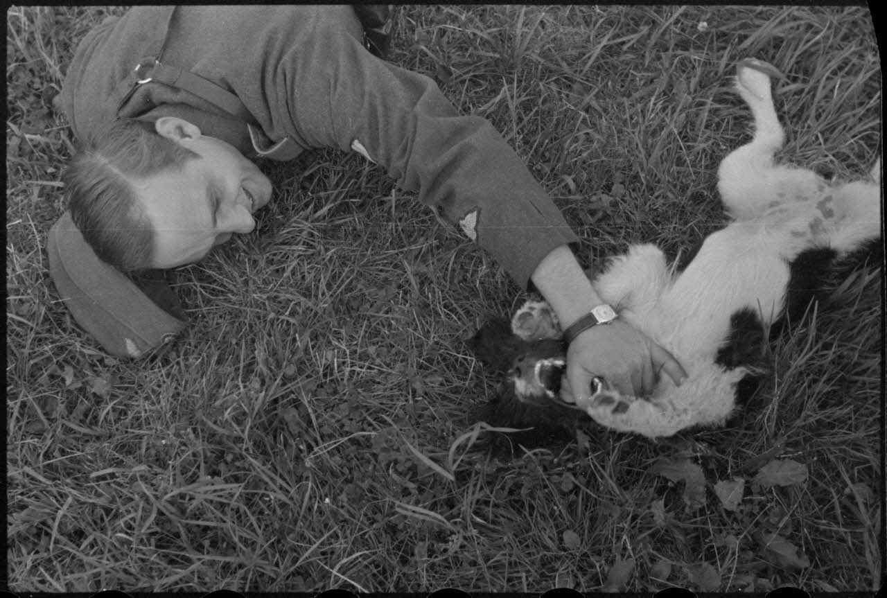 Sur le terrain d'aviation de Banak en Norvège, la mascotte et des pilotes de planeur DFS-230 du Luftlandegeschwader 1 (8./LLG 1).