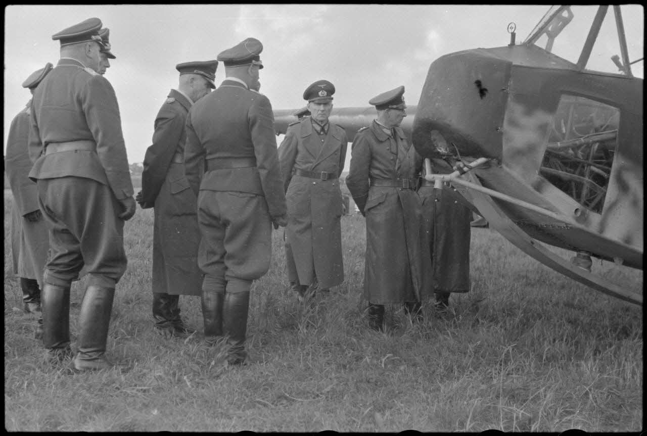 Le capitaine commandant l'aérodrome présente aux autorités le planeur qui équipe l'unité aéroportée, un DFS-230 (immatriculé LB+1-97). Dans le ciel évoluent d'autres avions. Munis de jumelles, les généraux observent la progression des appareils vers la piste.