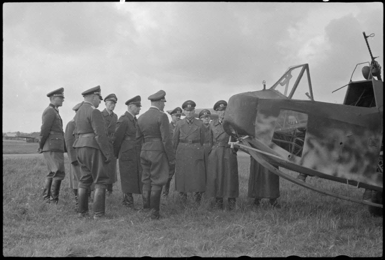 Le capitaine commandant l'aérodrome présente aux autorités le planeur qui équipe l'unité aéroportée, un DFS-230 (immatriculé LB+1-97). Dans le ciel évoluent d'autres avions. Munis de jumelles, les généraux observent la progression des appareils vers la piste.