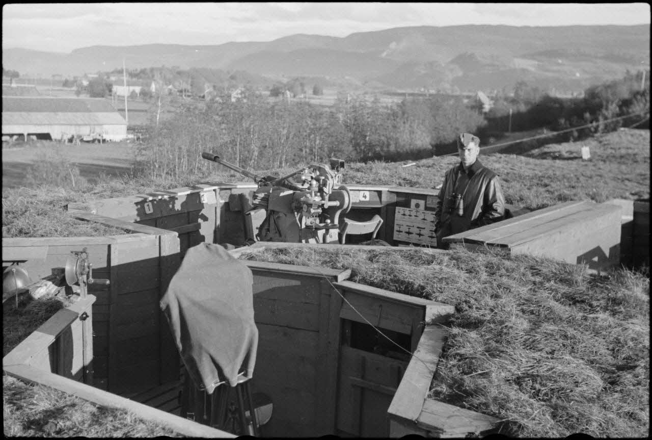 Sur un terrain d'aviation (région de Trondheim), un artilleur de la Luftwaffe monte la garde à proximité d'un canon antiaérien de 2 cm Flak 30.