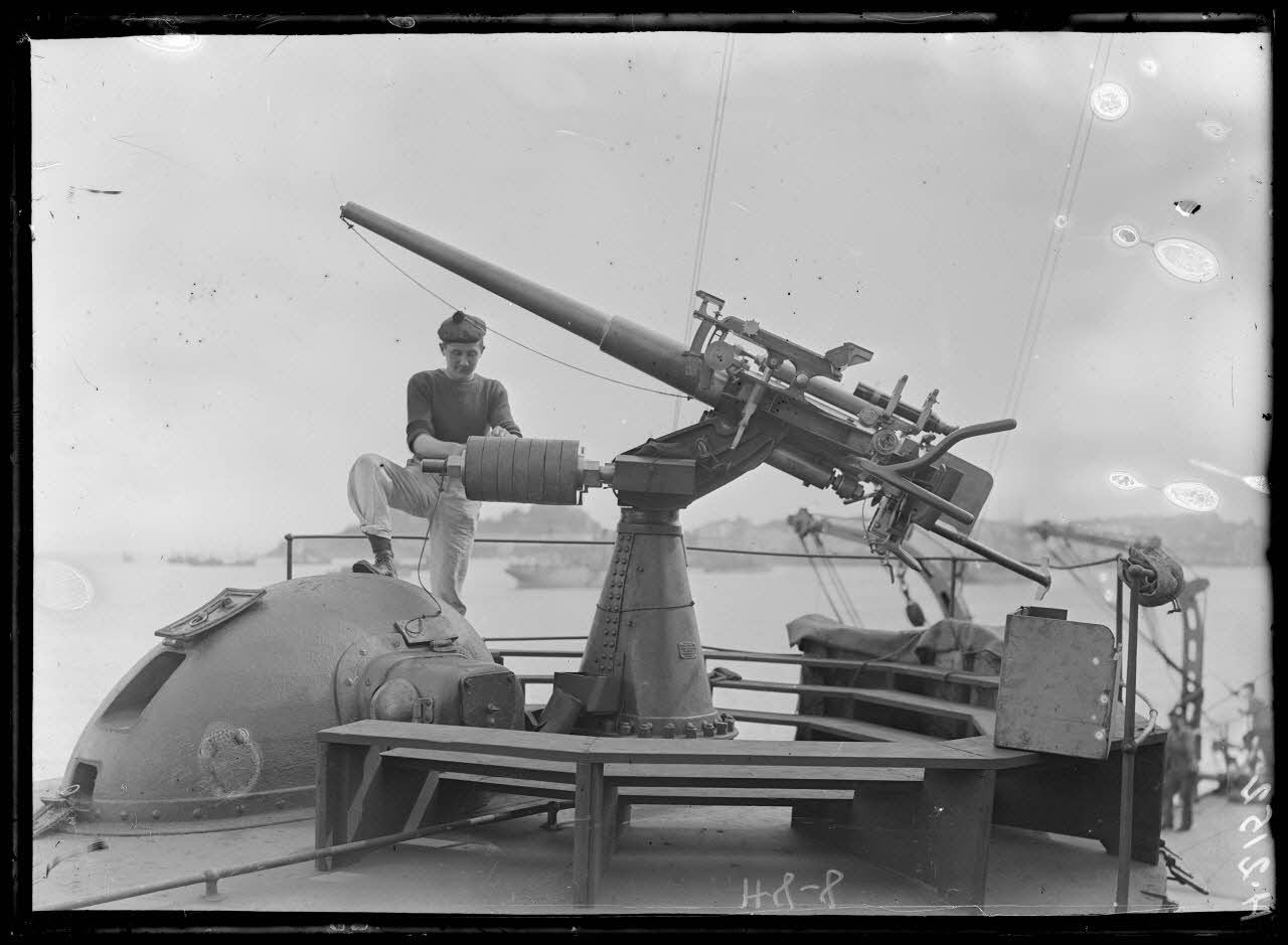 En rade de Corfou. A bord du Waldeck Rousseau. Canon de 47 contre-avions. [légende d'origine]