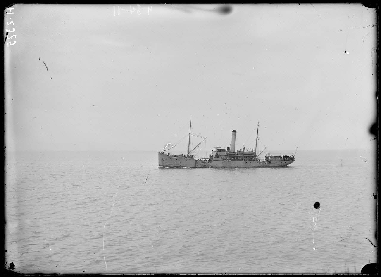 En rade de Moraitika. Le Corbière chargé de troupes serbes qui vont être transbordés sur le Néra. [légende d'origine]