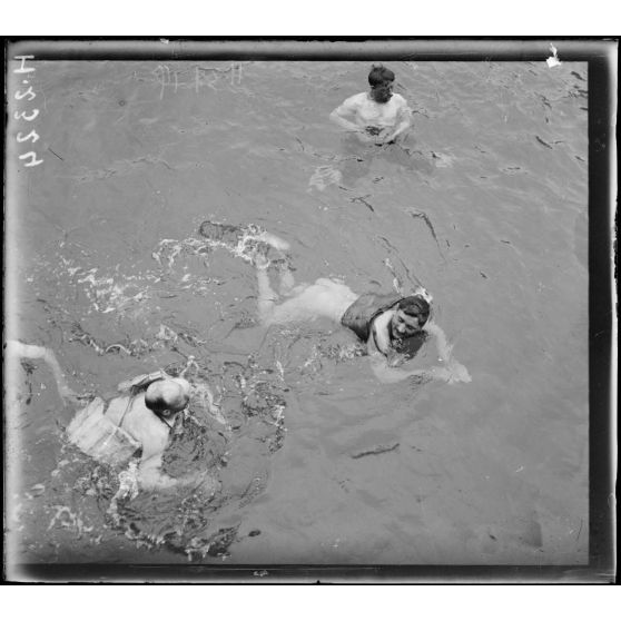 En mer. Exercice de natation (les hommes munis de ceinture de sauvetage).