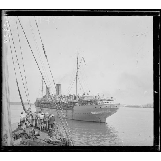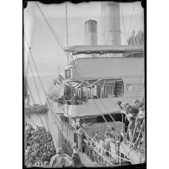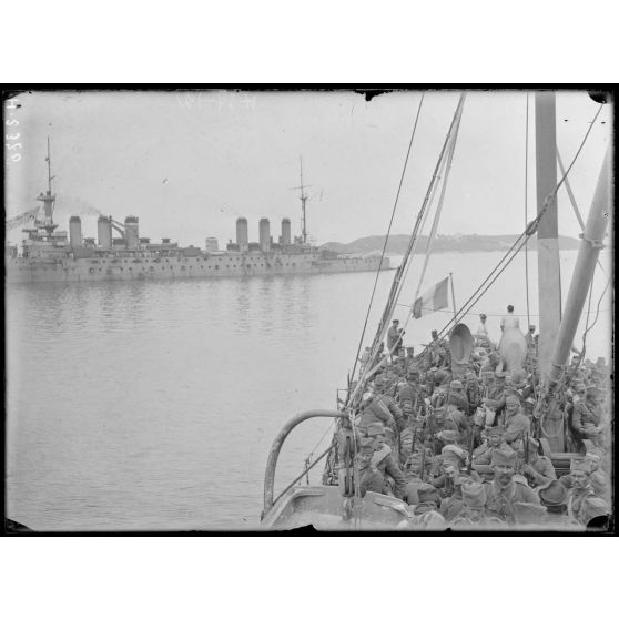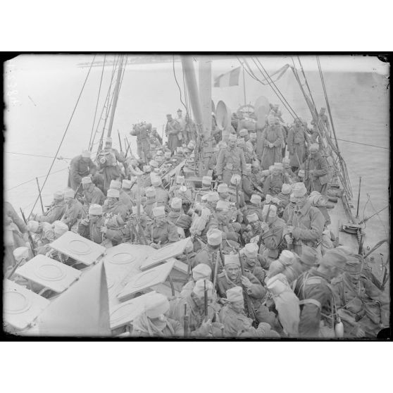 Rade de Govino. Serbes du 24e régiment d'infanterie de la division du Vardar à bord du Corbière.