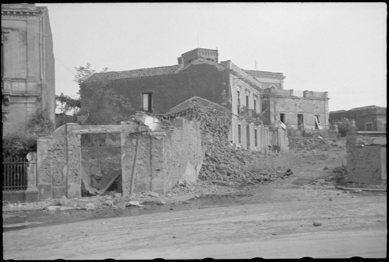 En Sicile, des destructions sur des bâtiments administratifs d'une ville causées par les combats.