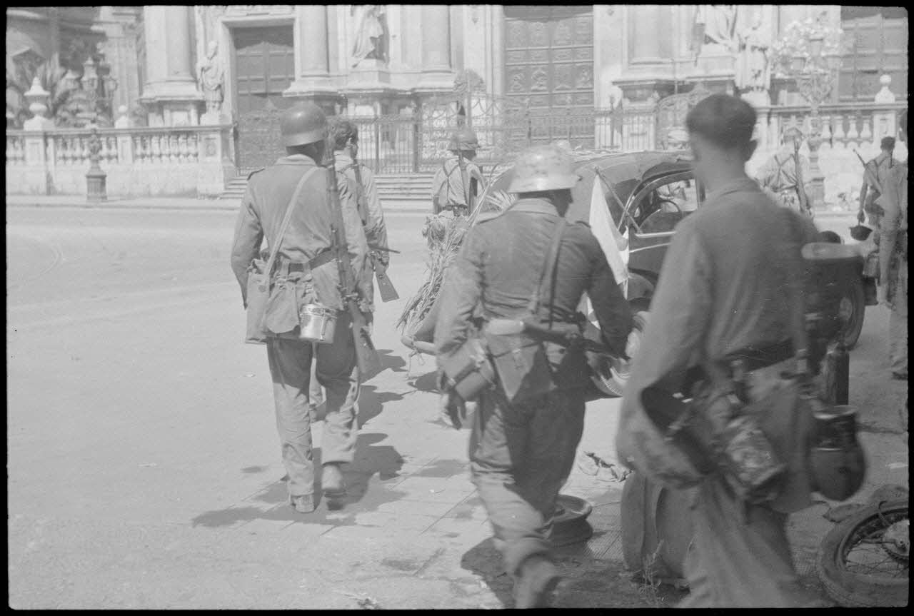 Un marin italien et des fantassins du Panzer-Grenadier-Regiment Hermann Goering dans une rue de Catane (Sicile).