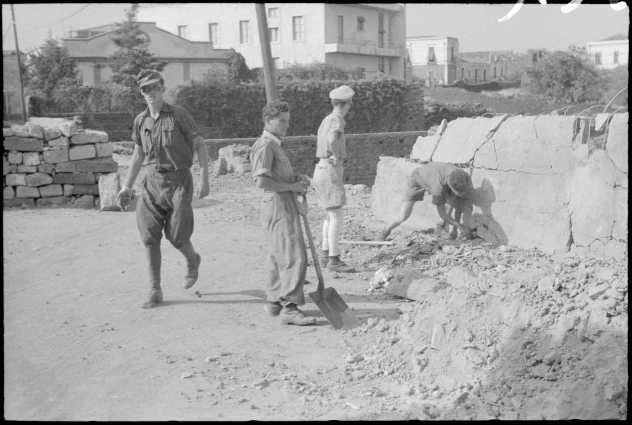 Construction d'obstacles dans les rues d'une ville côtière de Sicile (peut-être Catane).