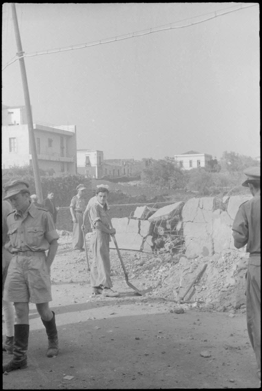 Construction d'obstacles dans les rues d'une ville côtière de Sicile (peut-être Catane).