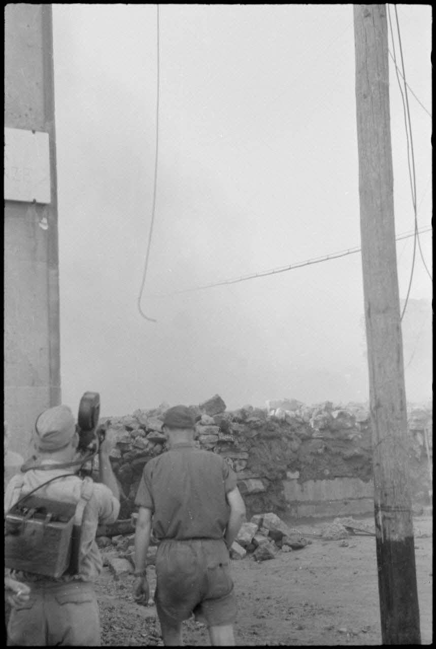 En Sicile, un caméraman de la section aéroportée allemande filme la destruction de murs par des pionniers parachutistes (génie allemand).