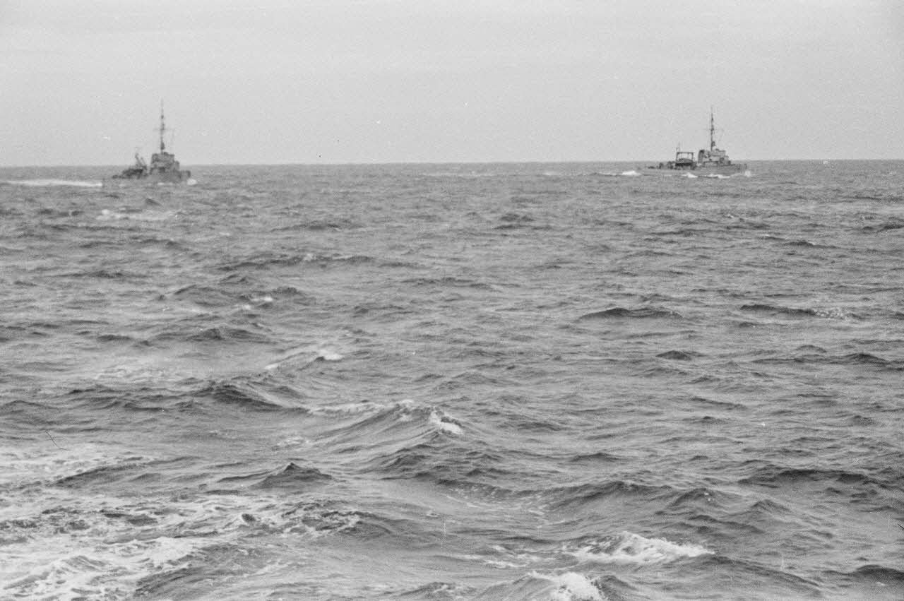 En vue de la destruction de mines, une patrouille de dragueurs de mines (Minensuchboot) de la Kriegsmarine.