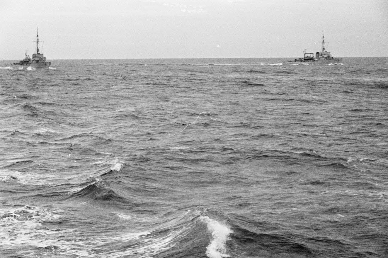 En vue de la destruction de mines, une patrouille de dragueurs de mines (Minensuchboot) de la Kriegsmarine.