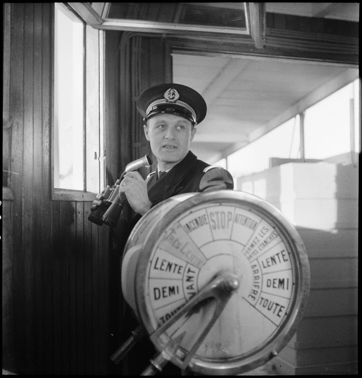 Lieutenant de vaisseau de quart à la passerelle du cargo réquisitionné Yang Tsé. Au premier plan, un transmetteur d'ordres mécanique ou Chadburn.