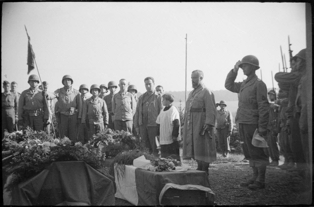 Lors des obsèques de deux officiers français de la 1re Armée française morts au champ d'honneur, un dernier hommage est rendu aux victimes par l'aumônier, un commandant et les hommes de l'unité, vraisemblablement un escadron de chasseurs d'Afrique. L'un des défunts serait le colonel Desazars de Montgailhard, chef de corps du 5e régiment de chasseurs d'Afrique (5e RCA) en 1943-1944 (1). Les familles endeuillées assistent également aux funérailles.