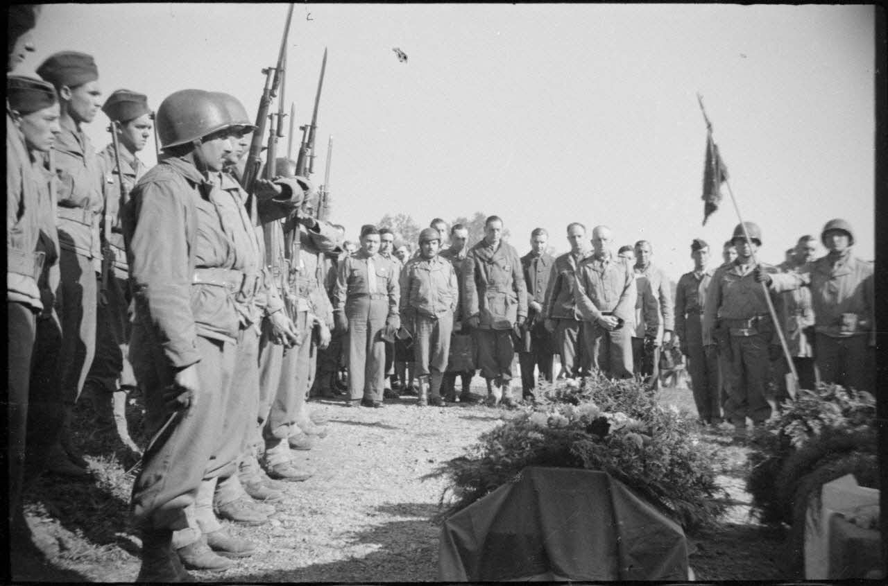 Lors des obsèques de deux officiers français de la 1re Armée française morts au champ d'honneur, un dernier hommage est rendu aux victimes par l'aumônier, un commandant et les hommes de l'unité, vraisemblablement un escadron de chasseurs d'Afrique. L'un des défunts serait le colonel Desazars de Montgailhard, chef de corps du 5e régiment de chasseurs d'Afrique (5e RCA) en 1943-1944 (1). Les familles endeuillées assistent également aux funérailles.