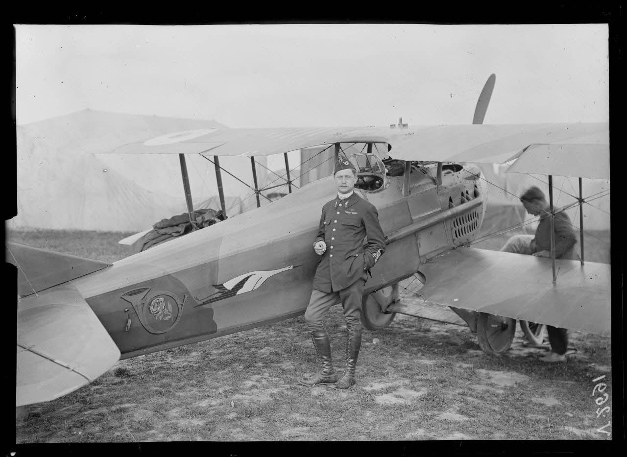 Le capitaine Xavier de Sévin, de l'escadrille n°26, pose devant son appareil SPAD XIII. Il remportera 12 victoires en combats aériens.