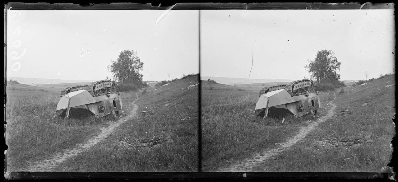 - Devant le village de Castel (Somme, 13/07/1918, V 2885 à V 2890) près du bois de Sénécat, les troupes françaises occupent les tranchées situées à l'extrémité du bois en L. Près de là, un char Schneider demeure retourné depuis l'attaque du 17 avril 1918.