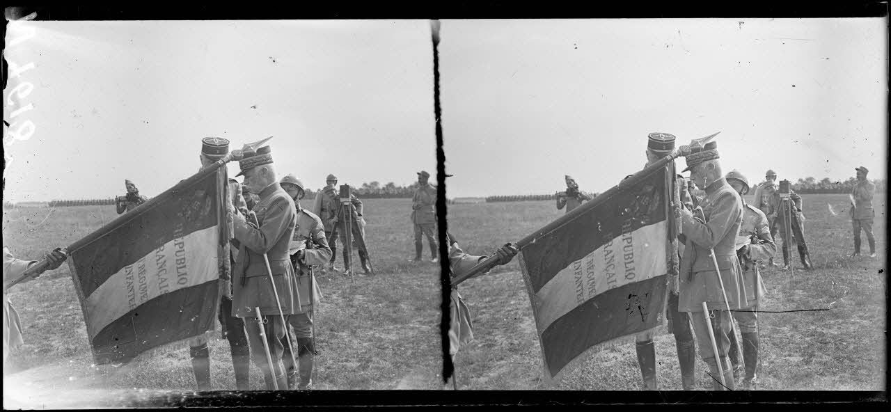 Entre Ramerupt et Dampierre (Aube). Prise d'armes pour la remise de la fourragère au 151e d'infanterie. Le général Fayolle décore le fanion de la compagnie 22/13 du 1er régiment du Génie (28-6-17).