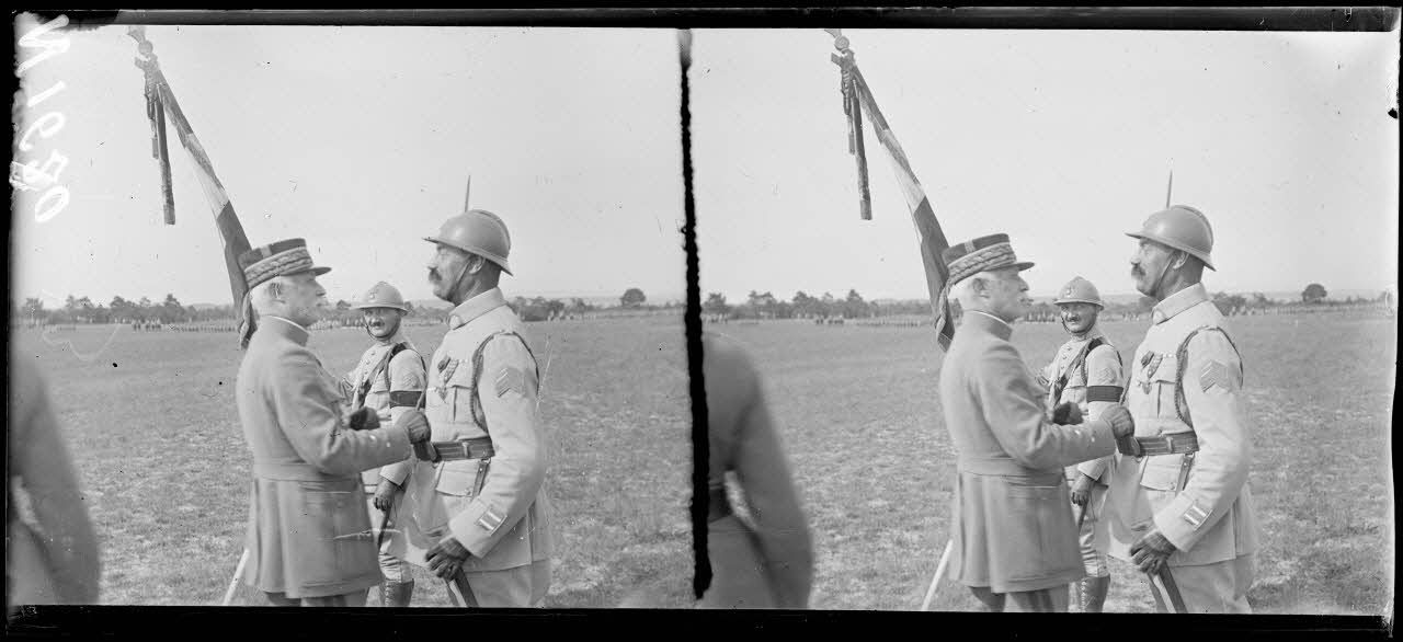 Entre Ramerupt et Dampierre (Aube). Prise d'armes pour la remise de la fourragère au 151e d'infanterie. Le général Fayolle félicite le colonel commandant le 151e régiment d'infanterie (28-6-17). [légede d'origine]