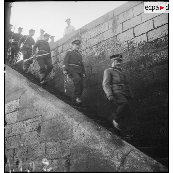 Douaniers montant la garde devant des stocks de denrées entreposées dans le port de Dunkerque, probablement saisies dans le cadre du blocus contre l'Allemagne.